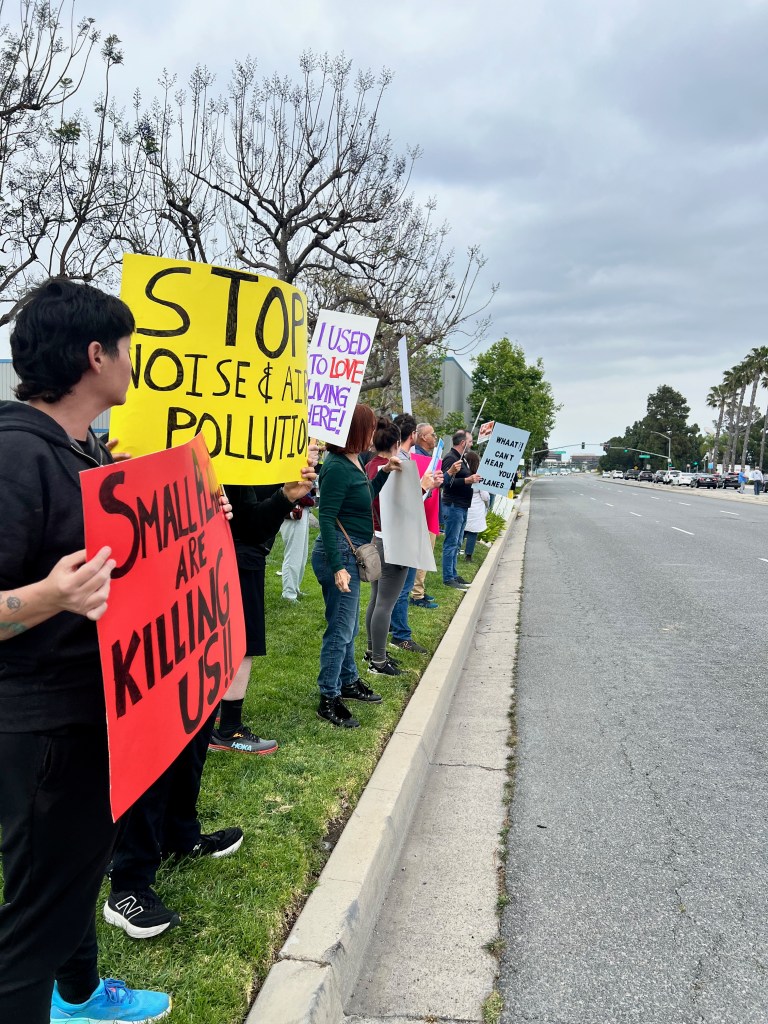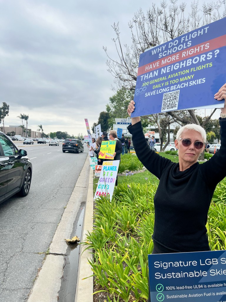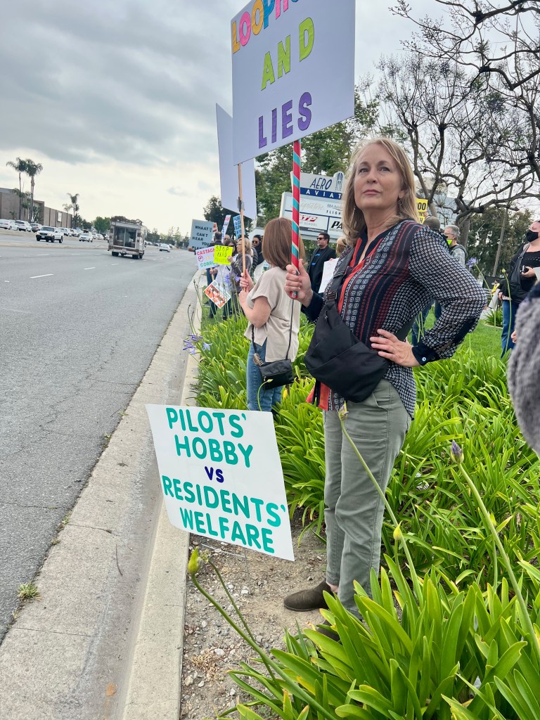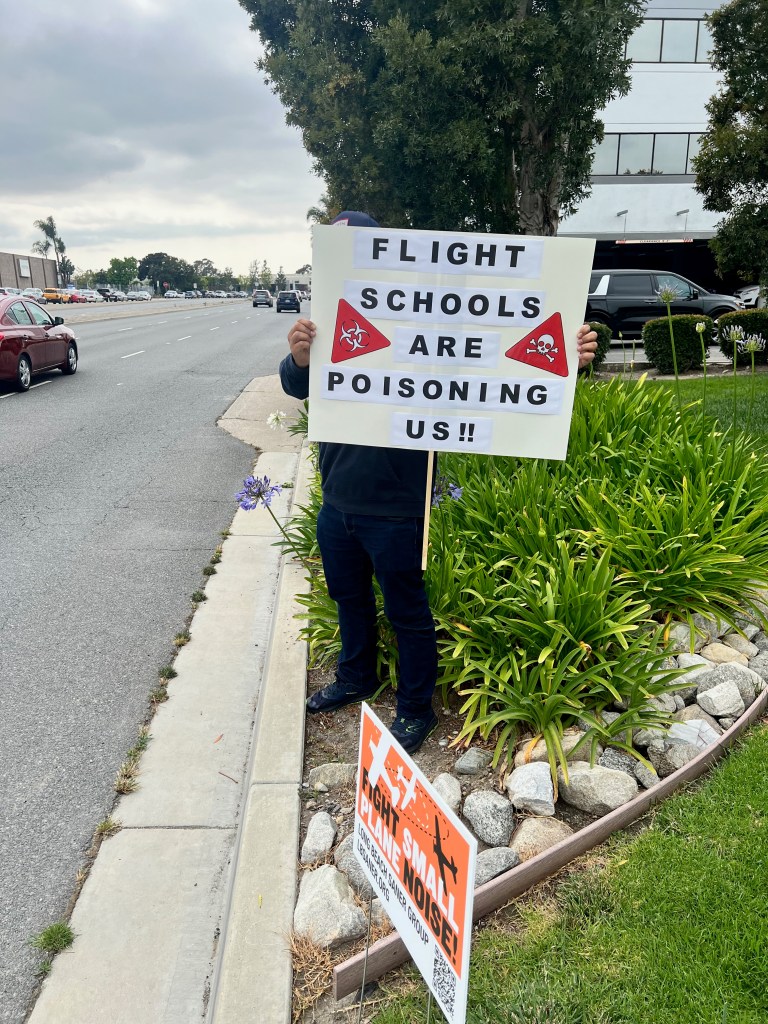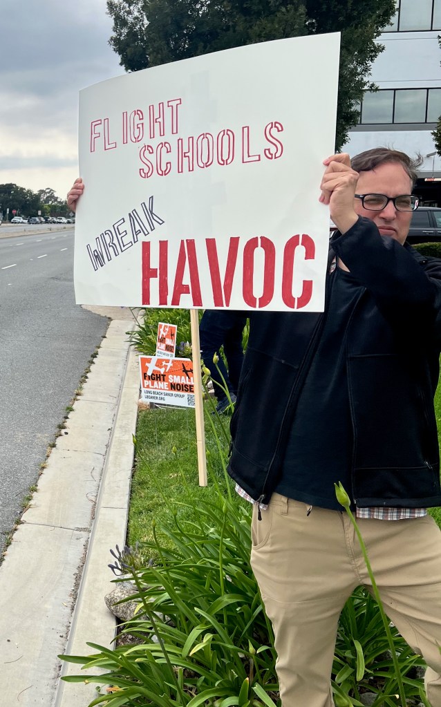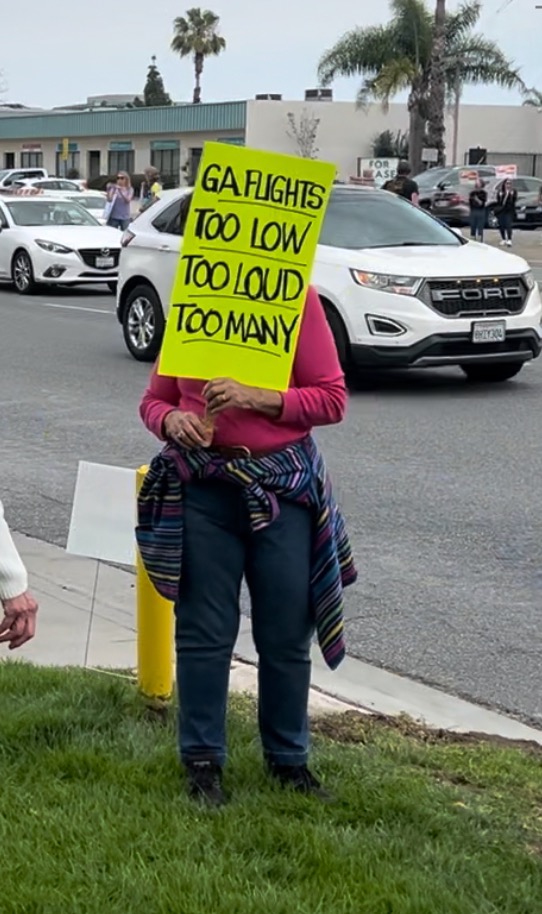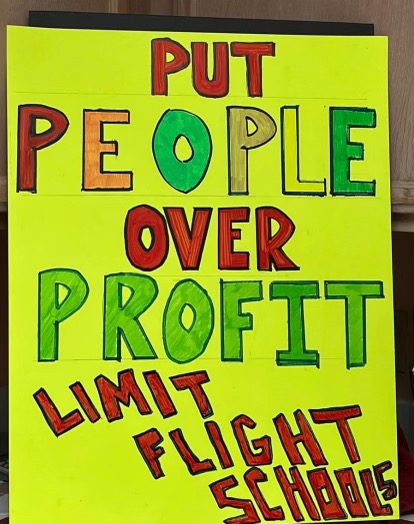 Last Thursday SANER staged a protest on Spring Street in front of the Aeroplex complex to bring attention to the increased high volume of flight school aviation operations that create noise and lead emissions over neighborhoods surrounding the airport.